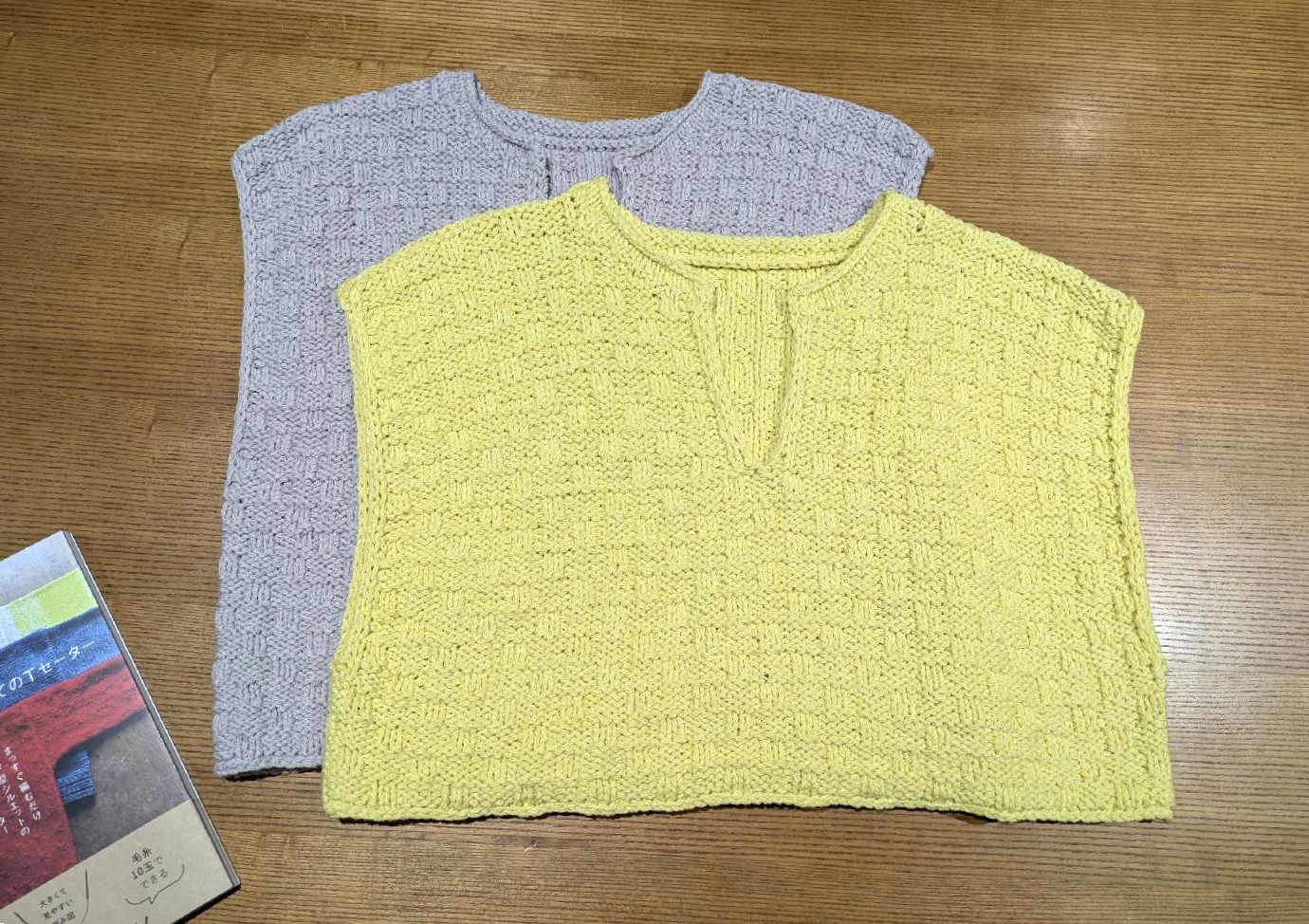 毛塚みどり著書『はじめてのTセーター』(グラフィック社)のワッフル模様のベストを糸替えして編みました。